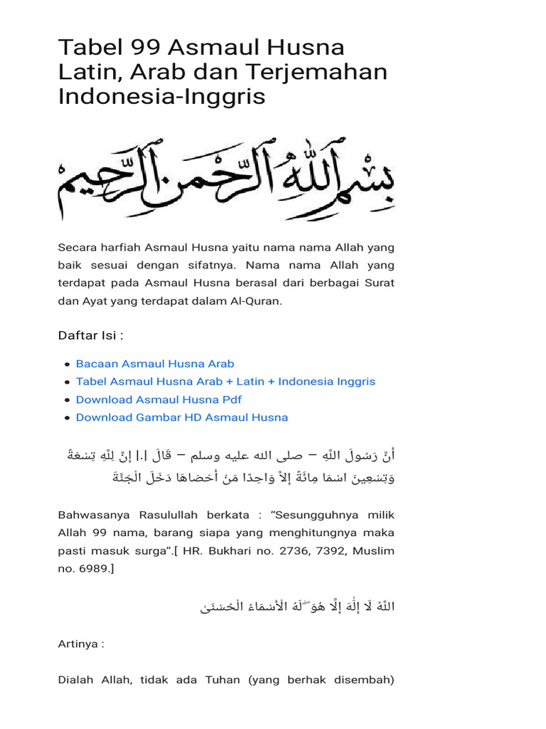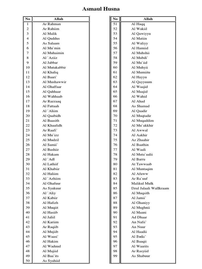 Ternyata saat ini tidak sedikit yang sama menggunakan nama persis dengan saya. Demikian ulasan lengkap mengenai asmaul husna, teks asmaul husna word, asmaul husna pdf, asmaul husna dan artinya pdf, asmaul husna anak, tabel 99 asmaul husna beserta artinya, asmaul husna dan doa, teks asmaul husna latin, tabel asmaul husna. Berikut 99 asmaul husna tulisan arab, latin dan terjemahannya: Membantu teman teman yang ingin menghapalkan asmaul husna sambil mendengarkan :)jangan lupa subscribe. Teks asmaul husna latin bismillahi badana.